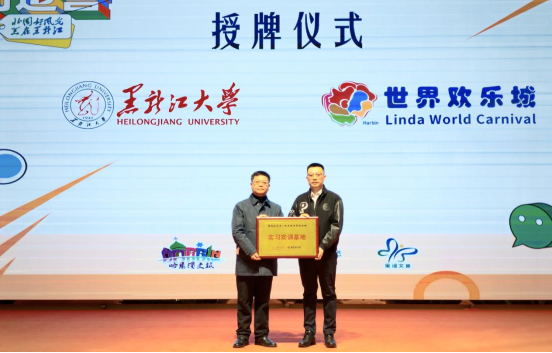 活动现场还举行了实践基地授牌仪式和战略合作协议签约仪式,黑龙江大学新闻传播学院为世界欢乐城授实习实训基地牌,世界欢乐城与哈尔滨鑫成文化传播有限公司签订战略合作协议,为未来校企协同、文旅传播搭建了更坚实的平台。