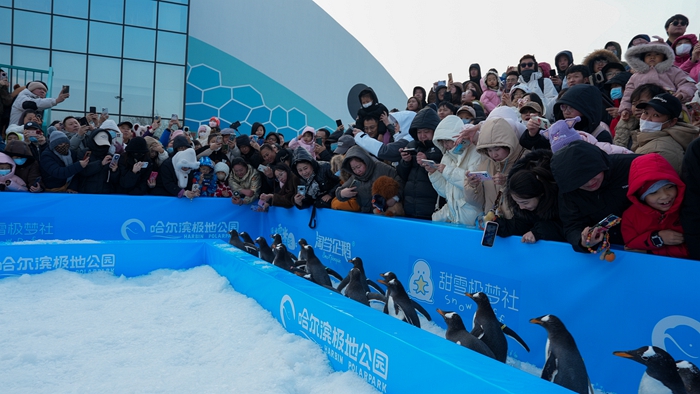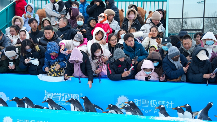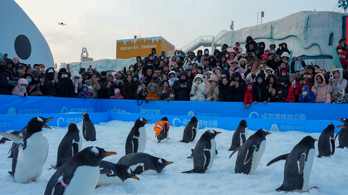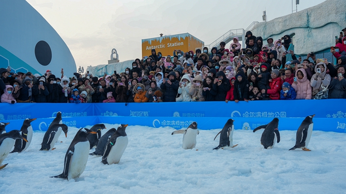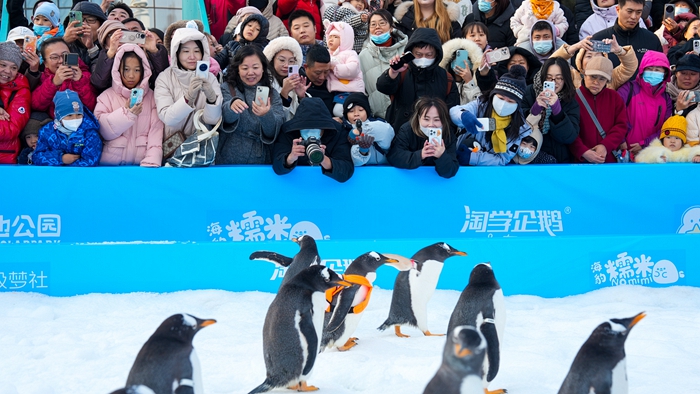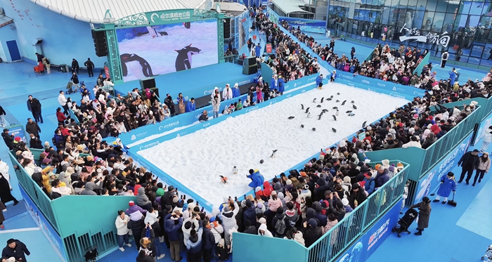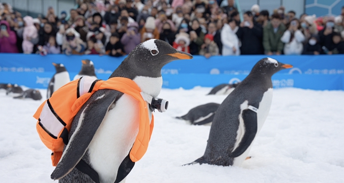 活动现场,企鹅们身着标志性“礼服”,在洁白的冰雪世界中蹒跚漫步、憨态可掬,引得观众笑声不断、纷纷举起手机记录这难得一见的温馨场面。