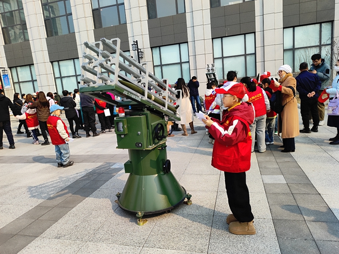 随后,一组人工影响天气作业装备引发了小记者们的浓厚兴趣。工作人员详细讲解了高炮如何防冰雹、火箭发射架如何通过播撒催化剂增加降水。在模型展位前,孩子们还近距离观察了火箭弹模型、地面碘化银燃烧炉模型、测紫外线设备等,对人工影响天气的技术手段有了更直观的认识。